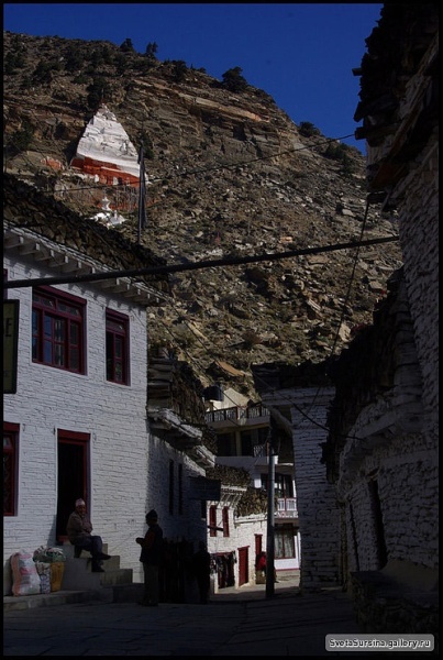 17 октября. Гималаи. Деревушка Марфа. Мы пришли в нее из Джонсома. Тут тепло и солнечно, в огородиках цветут поздние цветы, такие же как в России. В садах гулко падают переспевшие, знаменитые на весь Непал - яблоки. Мы в яблочном раю. Сюда стоит возвращаться, сюда нужно приезжать. Буддисткая ступа в скале над деревней, чистые узкие улочки, крыши, огороженные дровами, синее небо, и белые горы над всем этим... Заходим в ресторанчик, съесть знаменитый томатный суп, отведать свежих яблочных пирогов.