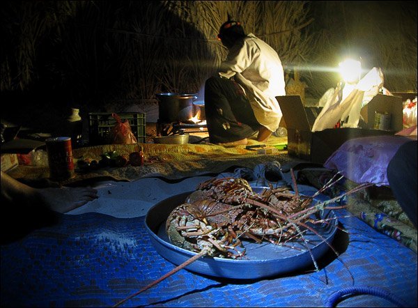 С этой северо-западной точки мы отравились на самый юг. Дорога, а местами лишь намеки на нее, тянулась вдоль вади Difarhu. После двух часов изрядной тряски (склонные к расстройствам вестибулярного аппарата, имейте в виду) мы прибыли не побережье Индийского океана. Кемпинг Аmak имел платные условия стоянки, душ и собственного повара. Мы как-то особенно тупо торговались и заплатили в итоге чуть ли не вдвое больше за пребывание в кемпинге. Т.о. омар обошелся нам в 10 долларов с человека, а стоянка - в 5. По утверждению местных, мы сильно переплатили :)